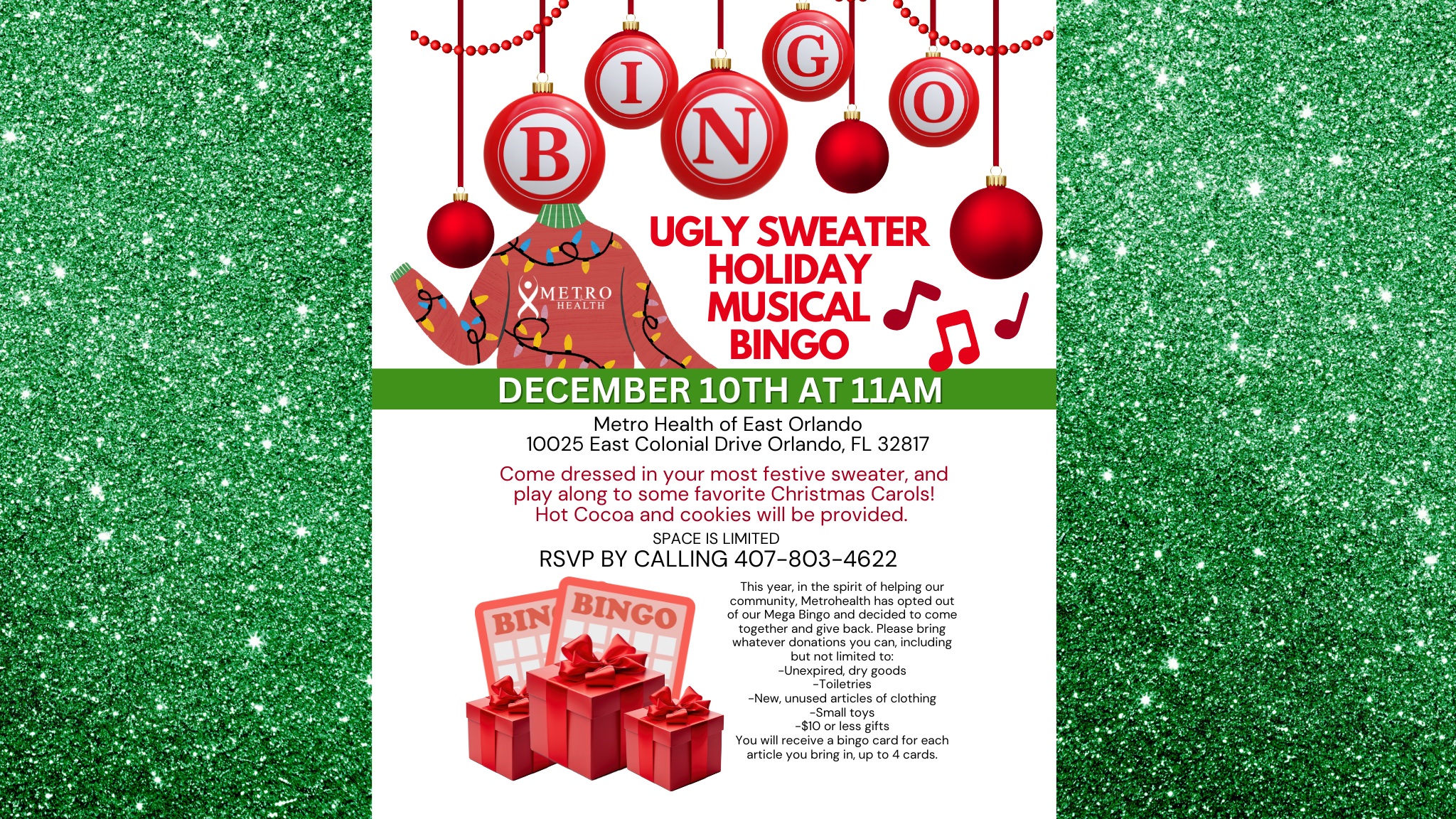Celebrate the season with MetroHealth of East Orlando at our Ugly Sweater Holiday Musical Bingo on Wednesday, December 10, 2025, at 11:00 AM.