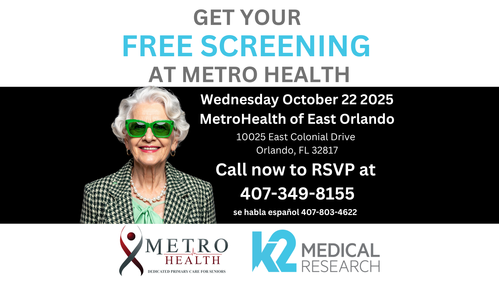 Get Your Free Memory Screening at Metro Health and K2 Medical are offering free health screenings throughout the month at multiple locations. Take advantage of this opportunity to stay on top of your health! Call now to RSVP at 407-349-8155. se habla español 407-803-4622