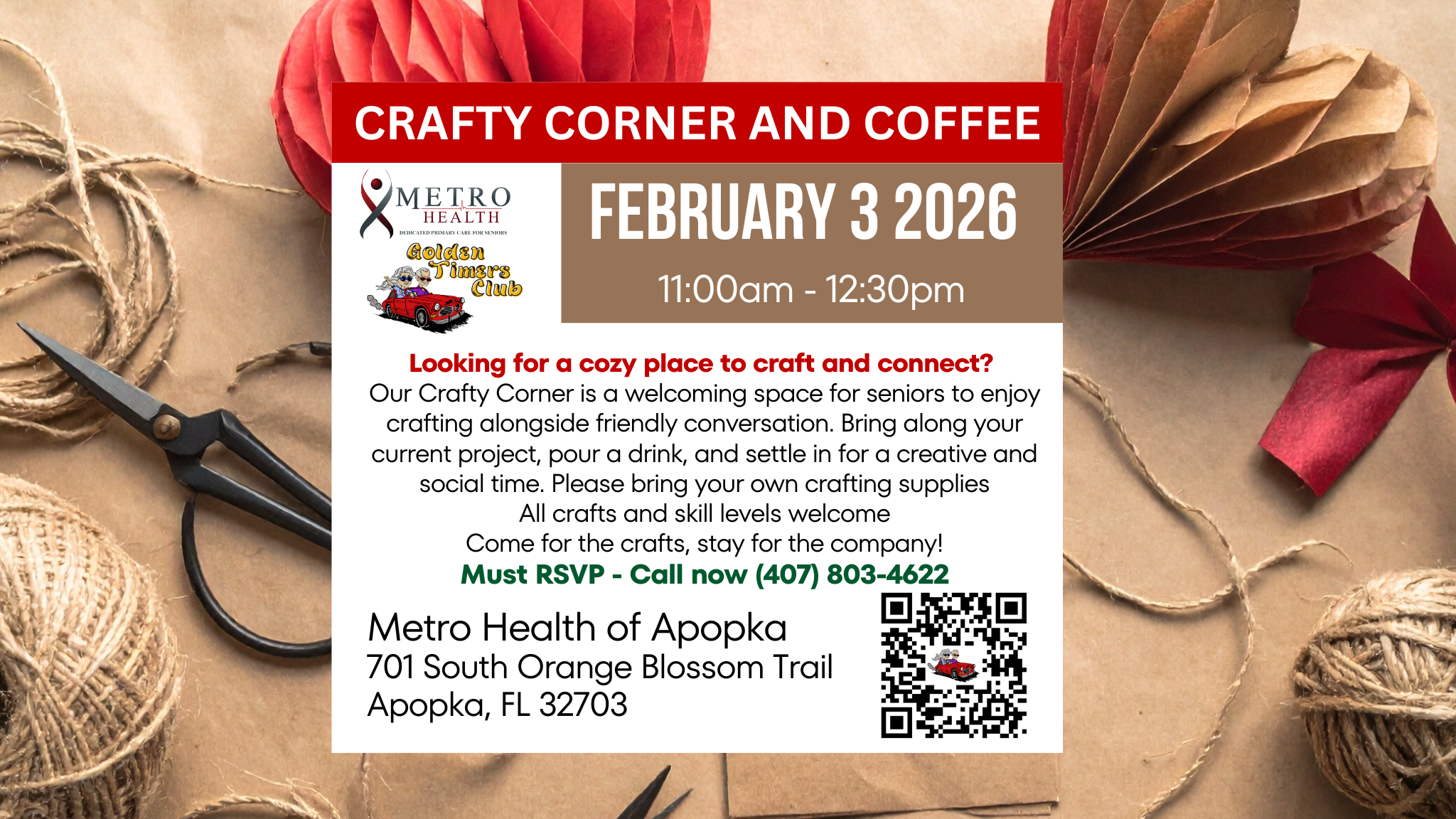 Join MetroHealth of Apopka for a relaxing and social Crafty Corner and Coffee event on Tuesday, February 3, 2026, from 11:00 AM to 12:30 PM.