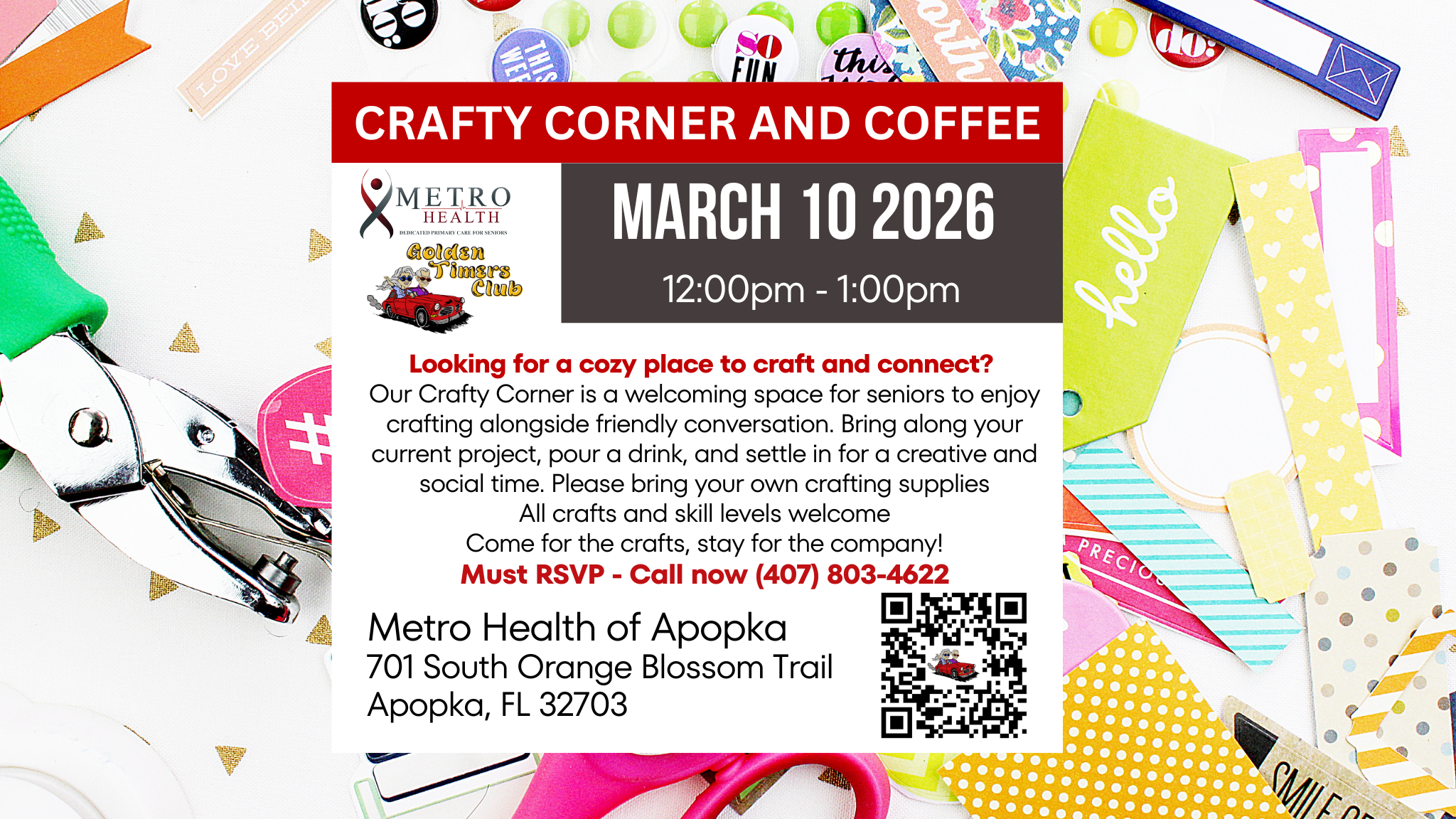 Join MetroHealth of Apopka for a relaxing and social Crafty Corner and Coffee event on March 10, 2026, from at 12:00 PM.