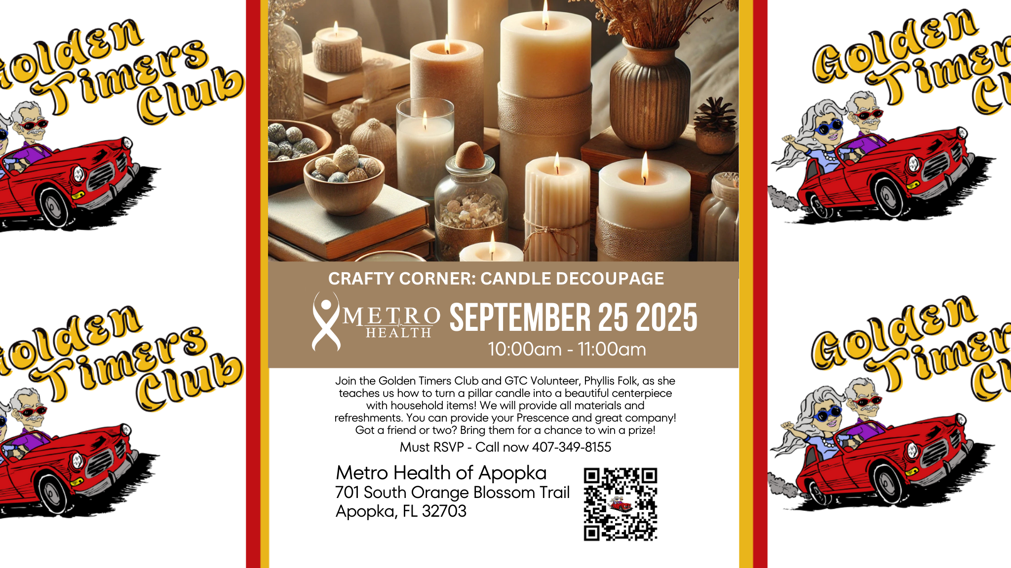 Create a stunning candle centerpiece with the Golden Timers Club and GTC Volunteer Phyllis Folk! Space is limited—save your seat and craft with us!