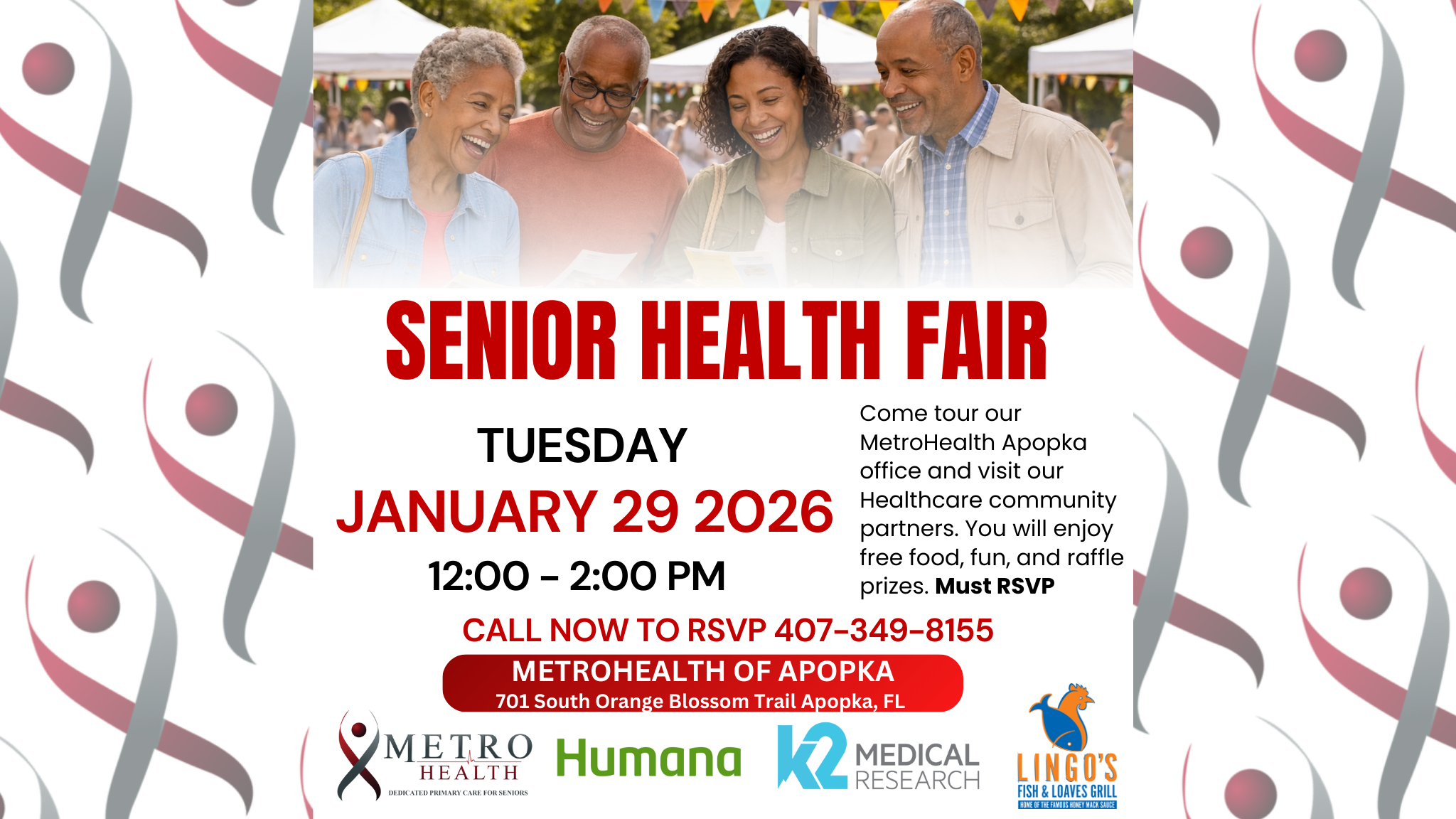 Join MetroHealth of Apopka for a community-focused Senior Health Fair on Thursday, January 29, 2026, from 12:00 PM to 2:00 PM.
