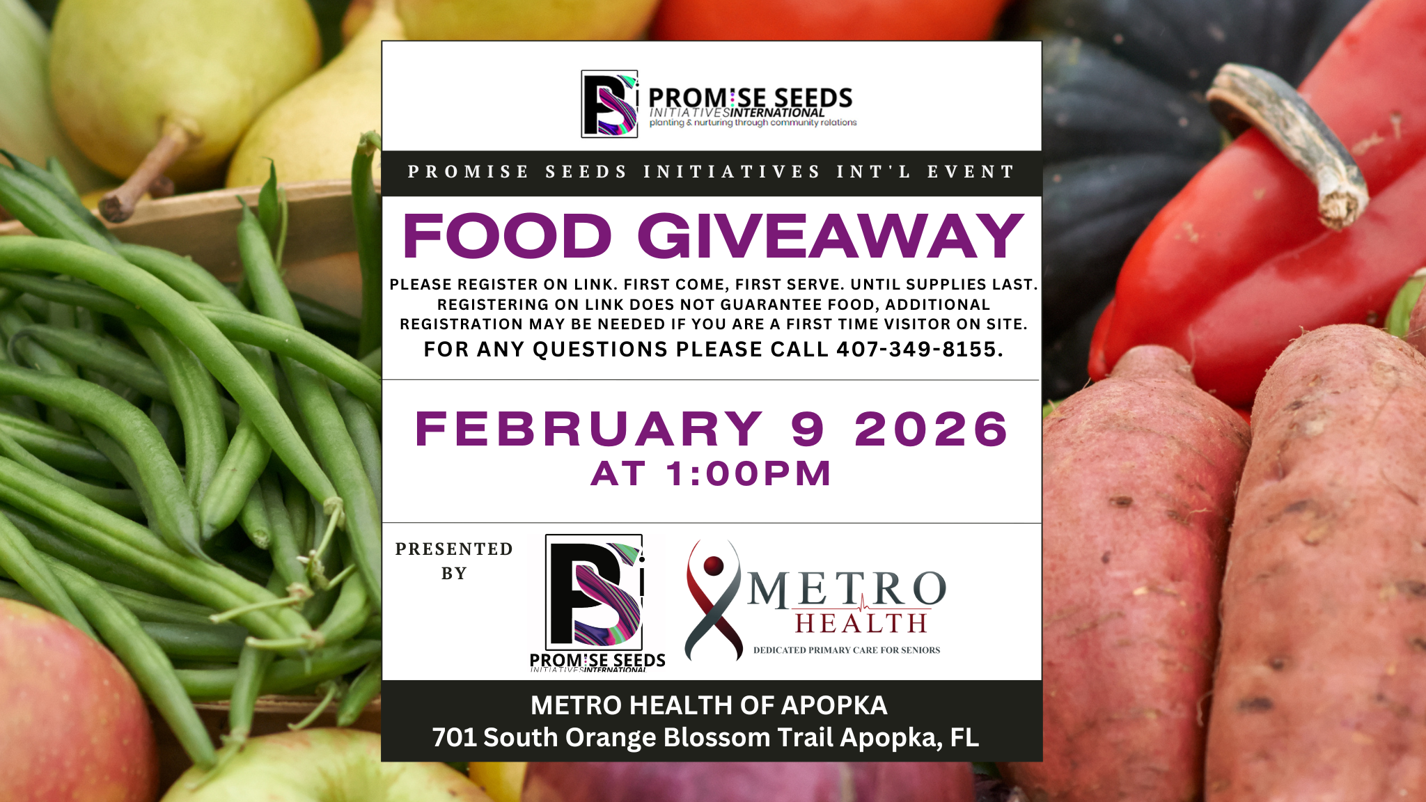 Details:Promise Seeds Initiatives Int’l is partnering with Metro Health of Apopka to host a FREE Food Giveaway for the community. This is an incredible opportunity to receive fresh and nutritious food for you and your loved ones.